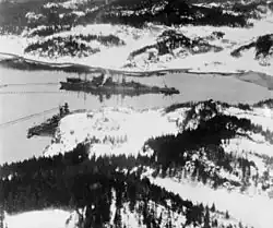 On 21 February 1942, Prinz Eugen, the heavy cruiser Admiral Scheer, and the destroyers Richard Beitzen, Paul Jakobi, Z25, Hermann Schoemann, and Friedrich Ihn steamed to Norway.[62] After stopping briefly in Grimstadfjord, the ships proceeded on to Trondheim. Two days later, while patrolling off the Trondheimsfjord, the British submarine Trident torpedoed Prinz Eugen.[60] The torpedo struck the ship in the stern, killing fifty men, causing serious damage, and rendering the ship unmaneuverable. However, on her own power she managed to reach Trondheim and from there was towed to Lofjord, where, over the next few months, emergency repairs were effected. Her entire stern was cut away and plated over and two jury-rigged rudders, operated manually by capstans, were installed.[56][63]