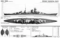 Prinz Eugen (German pronunciation: [pʁɪnts ˈʔɔʏɡeːn, - ˈʔɔʏɡn̩]) was an Admiral Hipper-class heavy cruiser, the third of a class of five vessels. She served with Nazi Germany's Kriegsmarine during World War II. The ship was laid down in April 1936, launched in August 1938, and entered service after the outbreak of war, in August 1940. She was named after Prince Eugene of Savoy, a distinguished 18th-century general in the service of the Holy Roman Empire. She was armed with a main battery of eight 20.3 cm (8 in) guns and, although nominally under the 10,000-long-ton (10,160 t) limit set by the Anglo-German Naval Agreement, actually displaced over 16,000 long tons (16,257 t).