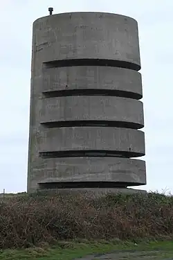 Six Marinepeilstände (MP) observation towers were built on high points. They are the most obvious symbol of German construction. Each observation slit of a tower observed for one particular battery and was fitted with range finding equipment.[16]: 101 Naval Range-finding Tower MP 3 at Pleinmont, which has 5 observation levels and had a radar unit on the roof, has become a museum, open to the public.