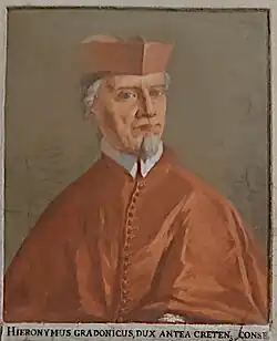 Gerolamo Gradenigo was born probably in Venice in August 1597 to the Gradenigo family,[1] one of the noblest among the Venetian aristocracy, son of Giovanni Giacomo.[2] He took the ecclesiastic life and became Primicerio (i.e. first priest of the canons) of the cathedral of Candia.[2]