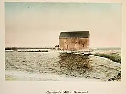 Gerretsen's Mill is an 18th century tide mill, at Gravesend, Long Island, also known as Johannes Gerritsen's Mill and the Whitney mill, derived its name from a 1750s Dutch miller in the area of Marine park, Brooklyn. The mill was situated near what is now known as Garritson's Creek and Mill Pond, formerly referred to as the Strome Kil. The origin of the name can be traced back to historical references, including an Indian deed mentioning land belonging to Hugh Garretson, likely referring to the same location. The farm was parceled to Dutch settler Wolfert Gerritse van Couwenhoven (1 May 1579 – 1662),an original patentee, director of bouweries (farms), and a founder of the New Netherland colony.[1] The three-hundred-year-old mill was destroyed by fire in 1935 by arson.[2]