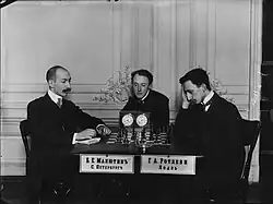 ![]() Chess masters Boris Maliutin (left) and Gersz Rotlewi | |