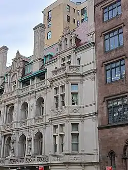 On the 72nd Street elevation, the first floor has storefronts (similar to those on Madison Avenue), and the entire width of the facade is curved at the second and third floors.[19] On both stories, the second and third stories are composed of rectangular windows, which are divided by vertical transoms and horizontal mullions made of stone. The center window on each story is a triple window, which in turn is flanked by one double window on either side. There are friezes with cartouches below the second-story windows, as well as putti and foliate panels below the third-story windows. The fourth and fifth stories have a double-height dormer, similar to the one at the center of the Madison Avenue elevation.[17]