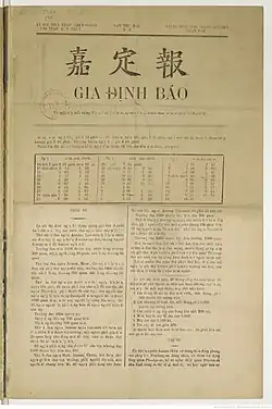 Gia Định Báo (chữ Hán: 嘉定報), was the first Vietnamese newspaper. It was published in Saigon from 1865 to 1910. Pétrus Ky was the editor in chief.[1] "Gia Định" is a historical name for Saigon, now Ho Chi Minh City. It was a gazette that published official and legal documents, although it also included articles on Vietnamese culture and agriculture.[2] Woodblock printing in Chinese characters remained the norm until the early 20th century, so the paper's use of the modern typography and the Latin alphabet were innovations.[3][2] In the 1890s, it was Vietnam's newspaper of record.[4]