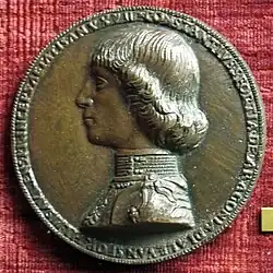 His first phase lasted from around 1455 to around 1471. It was marked by early attempts to move from casting to minting to produce medals. He and the Venetian Vittore Gambello spearheaded this development. Enzola's early medals are rudimentary, cutting straight into the metal of the small 4 cm diameter negative-matrices from which they would be struck, similar to those already used for coins. This phase included his series for count Pier Maria II de' Rossi and his mistress Bianca Pellegrini, medals for Francesco Sforza and single medals for Cecco Ordelaffi, lord of Forlì (1457) and Taddeo Manfredi, lord of Faenza (1461). They were inspired by the tradition established by Pisanello, showing humanist profile portraits on the recto and a related heraldic or allegoriccal scene on the verso. Their relief was usually very crushed and slightly unclear.[2]