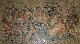 The same central group of Zeus, Athena, Heracles and Gaia, found on many early Attic vases, also featured prominently on the Pergamon Altar. On the right side of the East frieze, the first encountered by a visitor, a winged Giant, usually identified as Alcyoneus, fights Athena.[132] Below and to the right of Athena, Gaia rises from the ground, touching Athena's robe in supplication. Flying above Gaia, a winged Nike crowns the victorious Athena. To the left of this grouping a snake-legged Porphyrion battles Zeus[133] and to the left of Zeus is Heracles.[134]
