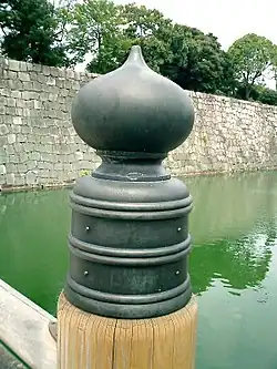 Gibōshi (擬宝珠) is a type of ornamental finial used on Japanese railings.[1] Gibōshi bridge ornaments resemble an onion; the ends are bulbous and typically come to a point. It is believed that the shape of gibōshi was from hōju (宝珠; "sacred gem" or "cintāmaṇi") which is used to decorate roofs.[2] They are often found on bridges in Japanese gardens, temples and shinto shrines.[2]