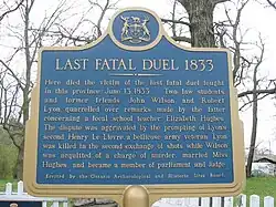Acland and his wife ran a school in Perth during their time there, and Acland became part of the story of the 1833 fatal duel between John Wilson and Robert Lyon: Elizabeth Hughes who was the central figure in the events leading to the duel was a teacher in the school, and Wilson wrote to Acland with allegations about her behaviour.[28][29] Acland adopted for a time David John Hughes (1820–1915), her brother; he was later adopted by Wilson, who married Elizabeth.[24][30] The school closed, and the Aclands moved from Perth.[29]