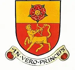 At the English College of Arms, the arms of Michal Giedroyc (born 1929, 16th generation in the Line of Bartłomiej) include both the rose and the centaur (called a sagittary in English heraldry) blazoned as follows: Per fess Or and Gules in chief a Rose Gules barbed and seeded proper and in base a Sagittary trippant to the dexter the head facing to the sinister his tail a serpent facing to the dexter holding in the hands a Bow with arrow drawn and set towards the head of the serpent all Or.