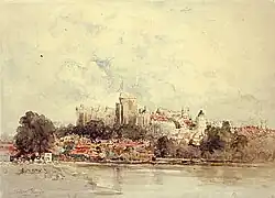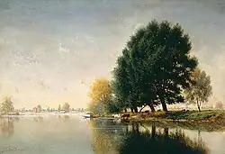In 1877, Munger moved to Europe, living first in London (where he became a friend of John Millais) and later in Paris.[5] In England, he painted reproductions of his Western landscapes (which were much in demand) as well as scenes around London, in Cornwall, and in Scotland. In France, he painted numerous landscapes along the Seine River and in the Barbizon region. At the instigation of John Ruskin, he also painted some 50 canvases of Venice; these are more vividly colored and looser in their brushwork than most of his earlier work.[1] In general, his European paintings are more atmospheric than his landscapes of the American West, showing the influence of J. M. W. Turner as well as of Jean-Baptiste-Camille Corot and other painters of the Barbizon School. The European period saw the height of Munger's success and fame, with some of his paintings selling for substantial sums in the $1000–5000 range ($20,000–120,000 today). He was made a Chevalier of the Legion of Honor in France and awarded medals by the governments of Germany, Russia, and Belgium.[1] He even took a side trip into writing, turning out a three-act comedy, Madelaine Marston, that was produced at the Theatre Royal in London in 1886 with Helen Barry in the cast.[1]