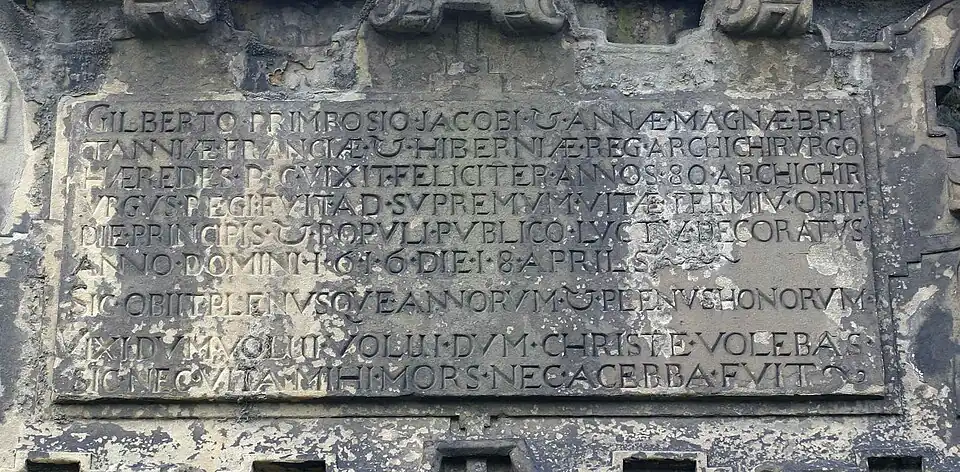 To Gilbert Primrose, Chief Surgeon to James and Anne, King and Queen of Great Britain, France and Ireland. His heirs erected this monument. He lived happily 80 years. To the end of his life he was Chief Surgeon to the King, and died, adorned with testimonials of public sorrow from Prince and people, in the year of our Lord 1616 on the 8th of April.