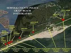 In December 2010, the remains of four victims designated as "The Gilgo Four" were found within a quarter of a mile of each other near Gilgo Beach. Six more sets of remains were found in March and April 2011 in Suffolk and Nassau counties.[2][3][4] Police believe the latter sets of remains predate the four bodies found in December 2010.[5]
