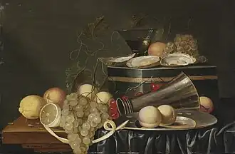 The last dated record related to Dandoy is a signed fruit still life on panel dated 1652, which was auctioned on 28 April 1965 at Sotheby's.[2] A Still Life with Oysters, Grapes, Lemons, Peaches, and Cherries auctioned at Sotheby's (New York, 31 January 2013, lot 233) is possibly dated to 1654.[3]