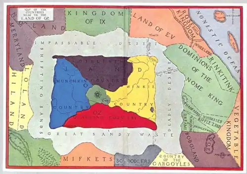 Oz, like all of Baum's fantasy countries, was presented as existing as part of the real world, albeit protected from civilization by natural barriers.[31] Indeed, in the first books, nothing indicated that it was not hidden in the deserts of the United States.[8] It gradually acquired neighboring magical countries, often from works of Baum's that had been independent, as Ix from Queen Zixi of Ix, and Mo from The Magical Monarch of Mo.[32] The first of these is Ev, introduced in Ozma of Oz.[20]