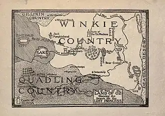Most of these regions are settled with prosperous and contented people. However, this naturally is lacking in scope for plot. Numerous pockets throughout the Land of Oz are cut off from the main culture, for geographic or cultural reasons. Many have never heard of Ozma, making it impossible for them to acknowledge her as their rightful queen. These regions are concentrated around the edges of the country, and constitute the main settings for books that are set entirely within Oz.[14] The Lost Princess of Oz, for instance, is set entirely in rough country in Winkie Country, between two settled areas.[15] In Glinda of Oz, Ozma speaks of her duty to discover all these stray corners of Oz.[16]