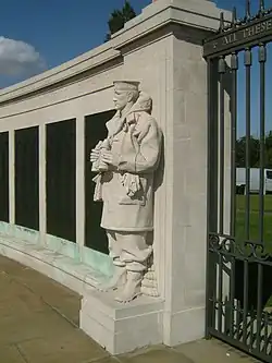 In 1924, a war memorial was unveiled at the junction of Mill Road and Brompton Road in Gillingham to commemorate the borough's fallen from World War I. Designed by sculptor F.W. Doyle-Jones, the Gillingham War Memorial is a stone obelisk featuring sculptural roundels and inscriptions. Later additions honored those lost in World War II and the Korean War. Originally located at the junction, the memorial was relocated in the early 1970s to its current position outside Medway Park Sports Centre. It was granted Grade II listed status in 2016 for its architectural and historic significance.