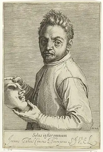 Gabrielli was particularly famous for portraying several characters talking together in different languages.[1] The 18th-century historian Francesco Saverio Quadrio relates that Gabrielli was able to impersonate women with his voice only, without the benefit of a costume change.[2] His portrait was engraved by Agostino Carracci.[3]