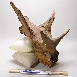Giraffokeryx is an extinct genus of medium-sized giraffids known from the Miocene of the Indian subcontinent and Eurasia. It is distinguished from other giraffids by the four ossicones on its head; one pair in front of the eyes on the anterior aspect of the frontal bone and the other behind the eyes in the frontoparietal region overhanging the temporal fossae. It has a brachydont dentition like in other giraffids and its legs and feet are of medium length.[2] Giraffokeryx is considered monotypic by most authors, in the form of G. punjabiensis, but other species have been assigned to the genus: