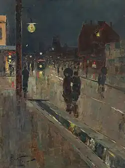 He migrated to Australia in 1885, first settling in Melbourne, where he shared a studio with fellow Italian Ugo Catani and the Portuguese-born Artur Loureiro. Upon relocating to Sydney in 1886, Nerli exhibited with the Art Society of New South Wales (ASNSW). He caused a sensation there later that year with his exhibition of paintings of bacchanalian orgies, and at an 1888 show his portrait of actress Myra Kemble attracted much attention. The free brushwork and unfinished appearance of his works were as exciting to connoisseurs as the subjects were to the general public. Nerli also joined the ASNSW's en plein air sketch club. It was likely through this club that he met the young painter Charles Conder, who was later acknowledged as having been influenced by Nerli's style. Conder subsequently became a leading member of the impressionistic Heidelberg School movement alongside Tom Roberts and Arthur Streeton. The degree to which Nerli influenced the movement as a whole is a matter of contention, but his "delicacy of touch, decorative placement, and choice of subject matter" were shared by Conder and Streeton in particular, and he is known to have visited their "artists' camps" in both Melbourne and Sydney.[1] Late in 1889 he went to Dunedin in New Zealand for the New Zealand and South Seas Exhibition where he encountered the artist Alfred Henry O'Keeffe. He went back to Australia in 1890.