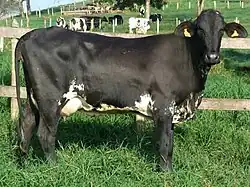 The Girolando is a breed of dairy cattle created in Brazil by crossing Gyr cattle from India, a Bos indicus (Indian humped cattle) breed which is resistant to hot temperatures and tropical diseases, with Holstein cows, a Bos taurus breed.[1] Coat colors vary from black to black-and-white Approximately 80% of the milk production in Brazil is produced from Girolando cows. A Girolando is 3/8 Gir and 5/8 Holstein.[2]