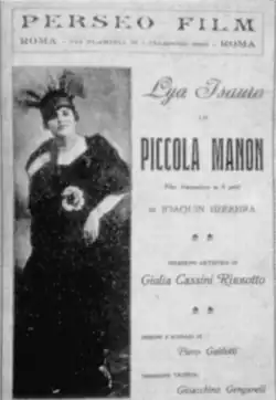 Unfortunately due to the low recognition of female directors and actresses in the early 1900s film footage is hard to gather and most of Rizzotto's work is hard to come by.[1] Her second film was co-directed with Mario Corsi and it was not fiction but it concerned the life of Leonardo da Vinci.[2]: 116 In 1920 she directed two films produced by Perseo Film and were both described as large.[2] Her acting in La Piccola Manon was well received but Lya Isauro and Alberto Monti who took leading roles less so.[1]
