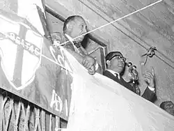 Initially, Genco Russo's political activity was in support of the separatist and monarchist causes (he was awarded the honorific title of Cavaliere della Corona d'Italia in 1946),[4] and ultimately for the DC party. During the crucial 1948 Italian general election that would decide on its post-war future, Genco Russo and Calogero Vizzini sat at the same table with leading DC politicians, attending an electoral lunch. In 1950, when Genco Russo's oldest son married, Don Calò Vizzini was a witness at the ceremony, just as the DC member and Sicilian Regional Assembly president Rosario Lanza.[4][19] He became a local DC leader and town councillor in the 1960s. In 1962 he was forced to step down after he was denounced in the press.[9]