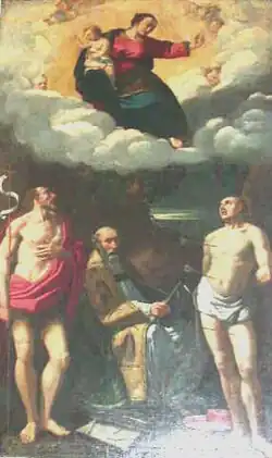 He is nicknamed il Bastaruolo (or il Bastarolo by authors writing in English), from a dialect term describing his father's profession selling foodstuffs, including corn (biade).[1] He painted the ceiling of the church of the Gesu in Ferrara, a work started by Giovanni Francesco Surchi. Mazzuoli was reportedly a pupil of Dosso Dossi, and the teacher of Carlo Bononi and Domenico Moni.[2] Among his works were some altarpieces for the Cathedral of Ferrara.