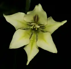 Gladiolus tristis is a species of gladiolus known by several common names, including ever-flowering gladiolus and marsh Afrikaner. It is native to southern Africa, especially South Africa. It is known in parts of Australia and coastal California as an introduced species. It is sometimes grown as a garden plant. This gladiolus typically grows one half to one metre in height, but has been known to approach 1.5 metres tall. It grows from a corm one or two centimetres wide. It produces three narrow, sheathing leaves. The inflorescence is a spike of two to eight large, fragrant blooms. Each flower has six white or cream tepals with greenish or purplish midlines. The flowers are said to have a scent similar to carnations and cloves.[1] Not all individuals possess scent because the allele for its presence is recessive in relation to the allele for its absence.