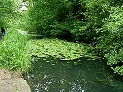 Today, limited traces of the canal remain, about one half being covered by the A470 Cardiff to Merthyr Tydfil trunk road, which was constructed in the 1970s.[12] Much of the Taff Trail between Abercynon and Merthyr Tydfil follows the line of the canal.[13] The section from Tongwynlais to the Melingriffith Tin Plate Works at Whitchurch has been retained in water and was used for fishing,[14] but is now the Glamorganshire Canal local nature reserve. In addition, there are a few bridges and locks which have not been destroyed.[15] There are also short stretches in water at Nightingales Bush and at Locks 31 and 32 in Pontypridd and there are plans for restoration here.[16]