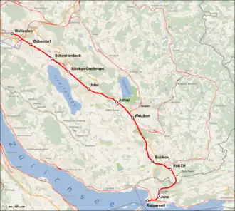 The line runs from Wallisellen, where it diverges from the Zürich–Winterthur line to Uster and Rapperswil. A second link from Zürich, via the Zürichberg Tunnel, joins the line just before Dübendorf, and both routes are used by through trains from Zürich. The line also has junctions with the Effretikon to Hinwil line, at Wetzikon, and the Tösstalbahn, at Rüti. At Rapperswil, it connects with the Lake Zurich right bank line, the Rapperswil to Ziegelbrücke line, and the Südostbahn over the Seedamm.[2]
