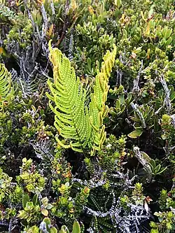 Gleichenia abscida, commonly known as dwarf coral fern, is an uncommon alpine fern found in southwestern Tasmania. Described by English born dentist and botanist Leonard Rodway,[1] that which distinguishes G. abscida the most from all other species of Gleichenia is its frond. While each other species of Gleichenia have a repetitively branching frond, G. abscida's frond consists of just two blades, with the apical axil between these two blades lacking meristematic tissue.[2]