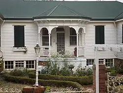 The west elevation, sitting on a brick base with exposed piers, has projecting gabled rooms to the southwest and northwest with shuttered sash windows and a central projecting bay-shaped porch. The porch has a hipped roof, eave brackets, batten railing and arched timber brackets with a concrete stair to a landing which splits into twin steps to the ground. The panelled timber entry door has a fanlight and two side sash windows with rose and clear glass with red glass borders. Low level windows in the brick base, to either side of the porch, light a service corridor behind.[1]