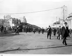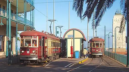 In 1927, ownership and operation transferred from the SAR to the Municipal Tramways Trust (MTT). Steam trains ceased on 2 April 1929 and the line was closed to be rebuilt as a double track standard gauge, electrified at 600 V dc and converted to tramway operation.[8] The Goodwood Overpass was constructed at this time, separating the new tram tracks from the conventional railway.[9] The line was reopened on 14 December 1929 with the city terminus reverting to Victoria Square. The Holdfast Bay line closed on 15 December 1929 for conversion but this was not undertaken due to the onset of the Great Depression.[3][4]