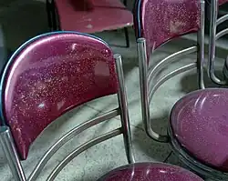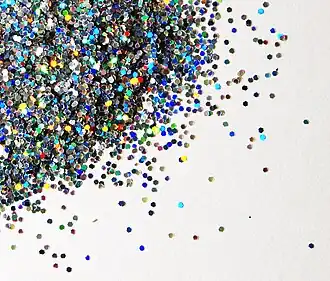 Today over 20,000 varieties of glitter are manufactured in a vast number of different colors, sizes, and materials.[18] One estimate suggests 10 million pounds (4.5 million kilograms) of glitter was either purchased or produced between the years of 1989 and 2009, however the source[19] provides no evidence or reference point. Commercial glitter ranges in size from 0.002 to .25 inches (0.05 to 6.35 mm)[20] a side. First, flat multi-layered sheets are produced combining plastic, coloring, and reflective material such as aluminium, titanium dioxide, iron oxide, and bismuth oxychloride. A common plastic is PET plastic, but mica can be used.[21][5] These sheets are then cut into tiny particles of many shapes, including squares, triangles, rectangles, and hexagons.[20]