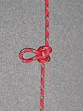 Directional Figure-of-eight Loop: The Inline figure-of-eight loop is similar to a figure-of-eight loop but used to form a loop that will be loaded longitudinally in a line under tension. Particularly useful in rope tightening systems where the loop is established as a means to secure a pulley or carabiner onto the main line to reduce the amount of work needed to tighten the entire system. Similar to a trucker's hitch. |