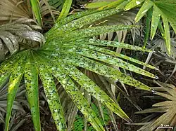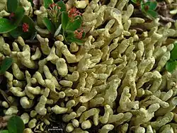Plural soredia. A powdery to granular reproductive propagule that is not covered with a well-defined cortex (in contrast to isidia, and contains both algal (photobiont) and fungal (mycobiont) components.[427] The term was first used by Erik Acharius in 1803.[3]