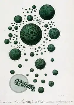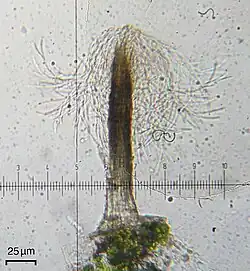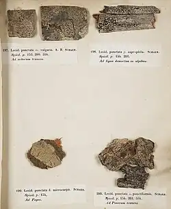 The increasing availability of the optical microscope as an aid to identifying and characterizing lichens led to the creation of new terms to describe structures that were previously too small to be visualized. Contributions were made by Julius von Flotow (e.g. epithecium), Edmond Tulasne (e.g pycnidium), and William Nylander (e.g. pseudocyphella, thecium). Gustav Wilhelm Körber, an early proponent of using spore structure as a character in lichen taxonomy, introduced amphithecium, muriform, and "polari-dyblastae", later anglicized to "polari-bilocular" and then shortened to polarilocular.[4] In the next five decades that followed, many other additions were made to the repertoire of lichen terms, subsequent to the increased understanding of lichen anatomy and physiology made possible by microscopy. For whatever reasons, there were not any new terms (still currently used) introduced from the period 1906 to 1945, when Gustaf Einar Du Rietz proposed replacing epi- and hypothecium with epi- and subhymenium; all four terms remain in use.[4] In some cases, older terminology became obsolete as better understanding of the nature of the fungal–algal relationship led to changes in their terminology. For example, after Gunnar Degelius objected to the use of gonidia for the algal partner, George Scott proposed the use of mycobiont and phycobiont for lichen components, recommendations that were generally accepted by lichenologists.[5]