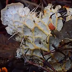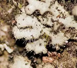 Also arachnoidal, araneose, araneous.[40] Having a cobweb-like form, like that of the irregularly oriented and loosely interwoven hyphae of the medullary layer of some lichens.[41]