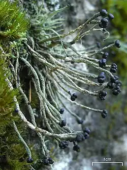Also defined: hepaticolous lichen; muscicolous lichen. A lichen that grows on a moss or liverwort – i.e. on a bryophyte.[73] A hepaticolous lichen is found only on liverworts, while a muscicolous lichen is found only on mosses.[74][75]