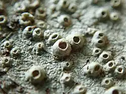 prominent apothecia with wide pores, black walls (viewed in microscopic section), and a smooth, more or less shiny thallus; this morphotype occurs in the genera Ampliotrema and Ocellularia.[30]