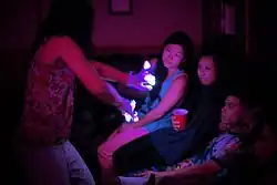 Gloving performances are called light shows and have become increasingly popular at raves in America.[1] Elements of hip-hop dance including liquiding, finger tutting, and popping have influenced gloving, and many of the same dance concepts and techniques can be applied to the dance form.[2] Prior to gloving, rave attendees twirled glow sticks, and before the addition of LED lights, glovers used plain white Mickey Mouse gloves, which reflected black light frequently employed at shows. [3] Sometimes when a person is gloving they grimace, as it's quite a taxing activity. Gloving is also referred to as fingering by some enthusiasts, however this is considered uncouth in some pro gloving communities.