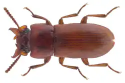 Gnatocerus cornutus, or the broadhorned flour beetle, is a common species of beetle in the Tenebrionidae family. It is distributed worldwide and is commonly found in warm, tropical regions, preferring grains, yeasts, and flours as its main diet.[1] The total development time is about 47 days.[2] G. cornutus is predominately found in mills as a storage pest and has a wide distribution.[1]