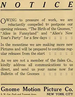 The company's lead actress was Mildred Hutchinson and employed its staff to produce stories about fictional gnomes, specifically for child audiences.[1] Hutchinson was a seasoned child actress at the time of the productions who had credits working with Edison, Vitagraph and Melies the age of six.[1] Records surrounding the release suggest that Alice in Funnyland, The Birth of the Gnomes and Alice's New Year's Party were never released. The venture ultimately failed and the City of New York sued Frederick Kalmbach, the company treasurer, for unpaid taxes on an assessment of $3,000. Kalmbach said that the Gnome Motion Picture Company was no longer conducting business when the assessment was made and the case was dismissed by the judge in 1918.[3] The last record of the Gnome Motion Picture Company in trade publications, in both announcements and advertisements, comes from a January 14 issue of Moving Picture World which announces all three of the films would be delayed for a "few days".[4] The American Film Institute still identifies all three films as having been released in January 1911 by Gnome.[5]