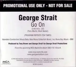"Go On" is a song written by Mark Nesler and Tony Martin, and recorded by American country music artist George Strait. It was released in July 2000 as the lead-off single from his self-titled album.