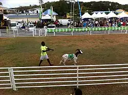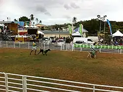 On race day, there is a parade of goats and jockeys through Buccoo village with commentators stating which goats are the favourites to win in their races.[2][14] This is usually followed by a cultural programme and brief formal ceremony.[2] Goat racing begins after these events.[2] Similar to racing horses, some goats can give trouble in the starting box.[16] Races are sponsored by local companies and accompanied by much shouting as spectators urge their favourites on.[17] Spectators can vote for and bet on their favourite goats.[3][4] In 2011, the Tobago House of Assembly's Facebook page hosted a "Vote for Your Goat" competition, which included full profiles on the goats including personality, history, and jockeys.[14] Prizes are awarded to winning goats.[4] Interspersed throughout the goat races are more cultural programmes and vendors selling local delicacies, sometimes out of their homes.[2] The day concludes at sundown with a huge street party.[2] The mood is one of celebration.[2]