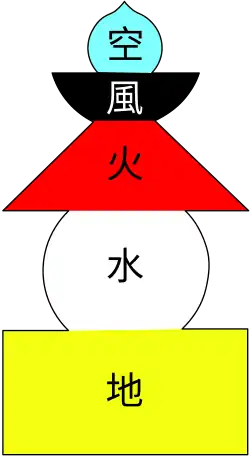 Japanese gorintō (五輪塔) (from 五 'five', 輪 'ring shape', and 塔 'tower') can be seen in Zen gardens and Buddhist temples, represented as stupas. They have five divisions to represent the five elements, although the five segments can be hard to discern. Touching the ground, the bottom-most piece represents chi; the next section represents sui; ka is represented by the middle section, while fū and kū are represented by the top-most two sections, pointing towards the sky. A gorintō is composed, from bottom to top, of a cube, a sphere, a pyramid, a crescent, and a shape resembling a lotus flower. These shapes also relate to the meanings described above.[3][10]