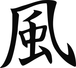 風 Fū or kaze, meaning "Wind", represents things that grow, expand, and enjoy freedom of movement. Aside from air, smoke and the like, fū can in some ways be best represented by the human mind. As we grow physically, we learn and expand mentally as well, in terms of our knowledge, our experiences, and our personalities. Fū represents breathing, and the internal processes associated with respiration. Mentally and emotionally, it represents an "open-minded" attitude and carefree feeling. It can be associated with will, elusiveness, evasiveness.