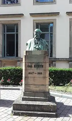 In 1873, Kurth became the first person to be awarded the "special doctorate in historical sciences", for a dissertation on Cato the Elder.[2] The same year, he became chair of Medieval History and Belgian History at the University of Liège. One of his students, Henri Pirenne, became a noted historian. Léon-Ernest Halkin considered them the founders of the scientific method of history in Belgium. Kurth modeled his pedagogy on that instituted by the German historian Leopold von Ranke at the University of Berlin. On 7 May 1894 he was elected a member of the Royal Academy of Science, Letters and Fine Arts of Belgium.[4] He was a member of the committee that organized the Exposition de l'art ancien au Pays de Liège for the 1905 International exposition in Liège.[5]