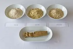 Gofio is thought to have been the main staple of the diet of the Guanches, the original inhabitants of the Canary Islands, who produced it from barley[5] and the rhizome of certain ferns. The latter is also known to have been used in historical times, especially in famine, even up until the 20th century.[6] Gofio derives from the name for the product in the aboriginal language of Gran Canaria, while in neighbouring Tenerife it was known as ahoren. Among the Berbers of North Africa, from whom the Guanche population largely derived, there existed a toasted barley flour with similar usage as a food, called arkul.[7] In Morocco, toasted flour is also mixed with, among other ingredients, almond paste, honey, argan oil, anise, fennel, and sesame seeds to make "sellou" (also called "zamita" or "slilou" in some regions), a sweet paste known for its long shelf life and high nutritive value. It was amongst the provisions of the crew of Thor Heyerdahl's "Ra II" expedition to cross the Atlantic aboard a papyrus ship using the Canary Current in 1970.[8]