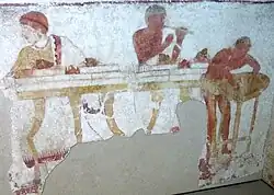 ...[Also] we find in the Tomba Golini pictures the preparations for the banquet celebrated in the pictures mentioned above. In one of the pictures we see cattle, venison, and poultry hanging in the larder as in a butcher's shop, in another the cooking in the kitchen itself, like everything else in Etruria, it is accompanied by the flute. To the left of the flute player a woman is struggling with a sideboard piled with food; to the right a naked slave with a loin-cloth is working at a small table, using two small implements rather like plummets. Various interpretations have been advanced: that he is kneading dough, or grinding colours... The table itself, at which the slave is standing, seems to have a raised edge...